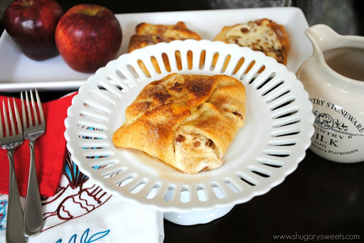 In mixing bowl, mix cream cheese with sugar and egg. Lay sliced apples in center of each square. Top with cheese mixture. Sprinkle with pecans and cinnamon sugar.