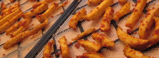 Grind sun-dried tomatoes in a spice (coffee) grinder to make sun-dried tomato powder. Mix this with spices and oil. Cut the peeled jicama into long fry shaped slices, but make them larger than you would fries as they will shrink about half their size in the dehydrator, so cut them about a half inch wide. Put the jicama slices in a bowl and sprinkle the spice mixture over them. Then toss well to coat each side well. Place slices on mesh sheets and dehydrate for about 12 hours.