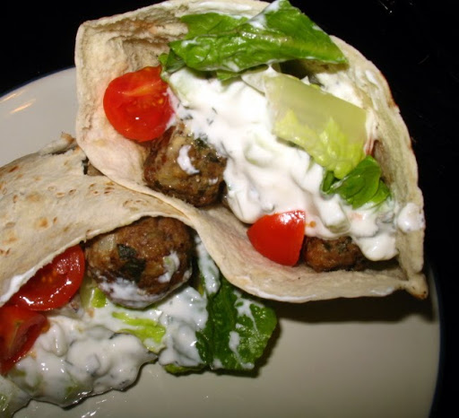 Slice off top 1/3 pita & open pocket. Slather inside with tzarziki, then fill with toppings & meatballs.