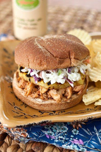 Pile the barbeque chicken on the bun, topping with the grilled pineapple, and coleslaw if desired.