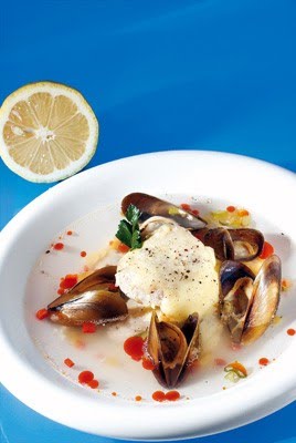 PESCADO GRATINADO Y CALDO DE MEJILLONES