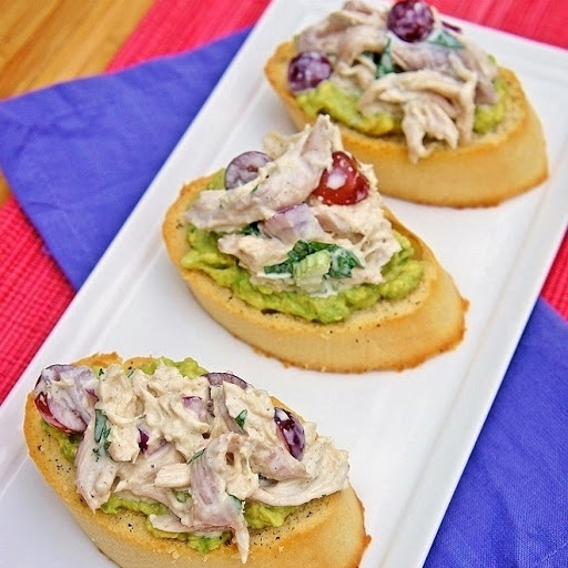 6. Top each baguette with 1/2 tablespoon of the Avocado mixture and 1 tablespoon of the chicken salad. Serve immediately.