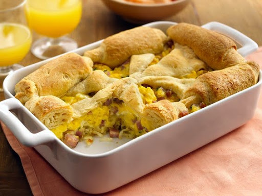 Separate dough into triangles. Starting at short side of each triangle, roll up halfway. Arrange over hot egg mixture with tips toward center; do not overlap.