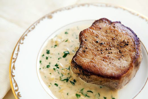 We eat a lot of pork in this family, even given my father's Germanic background. Pork chops are the most convenient, which is probably why I remember my mother serving them so often growing up. The chops were thinner, and almost always bone-in (there were a lot of kids gnawing on bones at our table). These days we get thicker chops and although we prefer bone-in, it just depends on what's available at the market that day. Given that we eat pork chops so often, dad is always on the look out for a good recipe. This recipe we pulled from the New York Times Sunday Magazine years ago and have made it several times since. It's easy peasy, and tastes so good! The Dijon cream sauce is just lovely with the pork. Great served with new potatoes.