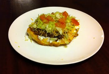 4.Top fry bread with ground beef, lettuce, cheese, tomatoes and sour cream. You can also top with other of your favorite taco toppings, such as onion, ranch or guacamole.