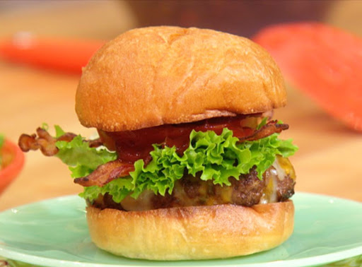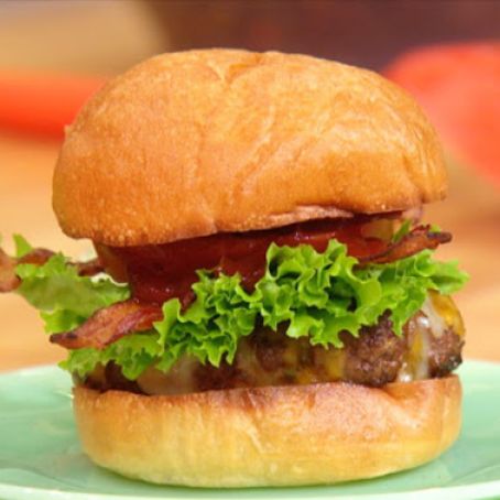 Place burgers on buns, top with bacon slices, lettuce, onions and chipotle ketchup.