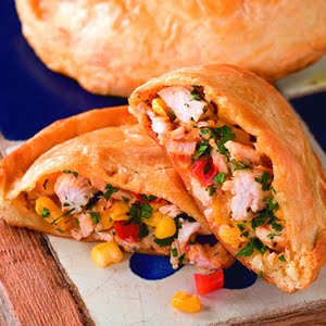 2. On a lightly floured surface, roll each piecrust into a 13-inch circle; cut into quarters. Spoon about ½ cup chicken mixture along one straight side of each triangle, about ¾ inch from edge. Brush edges with water. Fold other straight side of triangle over filling. Seal edges with a fork. Prick triangle several times with a fork. Repeat with remaining pastry and filling. Place wedges on a large greased baking sheet.