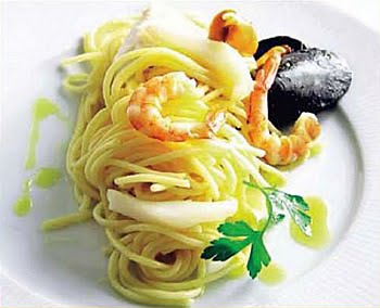 CALIENTA el aceite en una sartén, agrega el ajo picado y añade los calamares, las almejas, mejillones y los camarones. Dora y rocía con el vino.