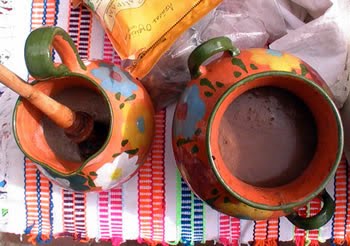 Se bate la masa en el agua y se pone a fuego lento sin dejar de moverla para que no se pegue. El piloncillo se lo ponemos de preferencia en una taza de agua y colado allí mismo le ponemos las pastillas de chocolate y seguimos moviendo constantemente hasta que se desagán cuando hierve se apaga. Y se sirve muy caliente