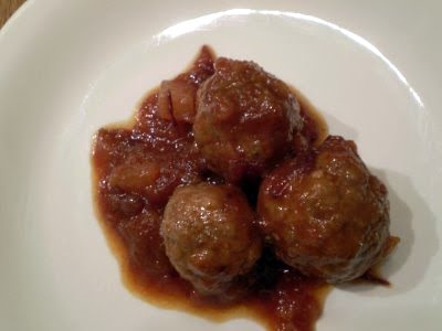 Combine ingredients, form into meatballs. Fry. Drain fat. Cover with the sauce.