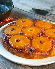 In a cast-iron skillet over medium heat, melt the butter. Remove from the heat and sprinkle the brown sugar around the skillet. Arrange the pineapple slices and pecans on top. Pour the batter evenly over the top and bake for 45 minutes.