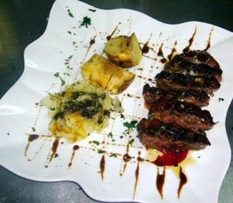 se montan los platos, colocando el magret, la manzana y finalmente la salsa de foie gras
