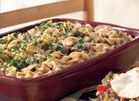 Add cooked noodles and beef mixture to gravy; stir to combine. Spoon mixture into sprayed casserole; cover.