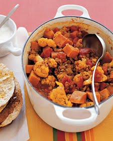2.Add curry powder; cook, stirring constantly, 1 minute. Stir in sweet potatoes, cauliflower, lentils, tomatoes and their juice, and 1 1/2 cups water; season with salt.