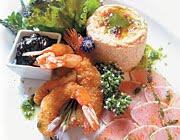 CARPACCIO DE SALMON Y CAMARONES AL COCO Y TIBIEZA