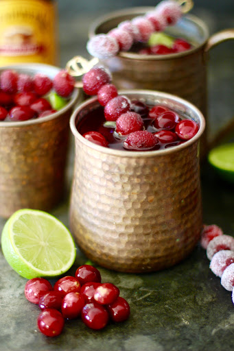 While this drink is served cold, the gin or vodka inside is sure to warm your heart. Now, in the ingredients section, you will see that I listed gin rather than vodka. That is a personal preference, so feel free to switch it out if you prefer vodka. Because it is the holidays and winter time, I like to use seasonal fruit. Cranberries and pomegranates are winter fruits and make for a delicious Moscow Mule. It also makes them color coordinated with all of your other holiday decorations, because don’t we all design food and drinks around our party decor? If there happens to be a non-alcohol drinker in your crowd, simply omit the gin and ginger beer, substitute those with ginger ale, and serve for a deliciously festive Moscow Mule Mocktail!