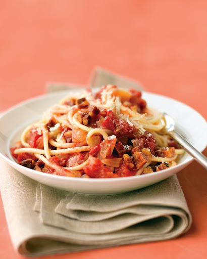 Increase heat to medium. Add onion and garlic to skillet; season with salt and pepper. Cook until onion begins to soften, 5 to 6 minutes, stirring occasionally. Add tomatoes (with juice); cook, breaking them up with a spoon, until sauce has slightly thickened, 5 to 8 minutes. Add sauce to pasta in pot; toss, adjusting consistency with pasta water if necessary. Serve pasta topped with pancetta and Pecorino.
