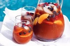 In a large saucepan bring 16 cups of cold water to boil. Remove from heat; add 8 tea bags (Tazo Passion or other fruit flavored tea). Let steep for 4 minutes; remove tea bags. Dissolve 1 cup of sugar in the tea; chill. Place 3 cups sliced fruit in a large serving bowl. Pour in tea and 4 cups of red wine. Add seltzer as desired.