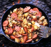 To cook, pour 3 tablespoons oil into a heavy 12-inch ovenproof skillet; place directly over campfire or on range top. Lift and tilt skillet to cover bottom with oil. Cut potatoes into 1/2-inch cubes; cut onions into thin wedges or chop. Cook potatoes and onions, uncovered, in hot oil over medium-high heat about 12 minutes or until potatoes are nearly tender, stirring occasionally.