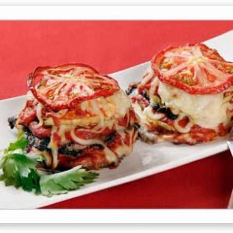 Assemble rounds. Mix together the mozzarella and parmesan and divide mixture into two small bowls. Set aside. Spoon a tablespoon of sauce onto grill side of mushroom caps then layer eggplant and a pinch of cheese mixture from one of the bowls on top of sauce. Repeat, alternating sauce, eggplant and cheese on all caps, ending with sauce, then one slice of tomato if desired. Top each round with the remaining cheese from the second bowl. Broil in oven for about 4 to 5 minutes until cheese is bubbly.