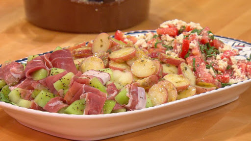 Arrange greens on large platter or plates and make stripes across the lettuce bed beginning with eggs then potato salad, then finishing with tomato salad.