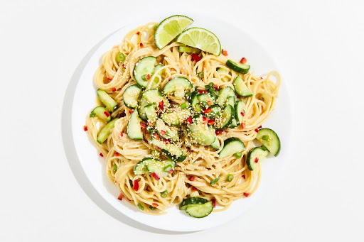Toss noodles to coat in sauce, then add chile, cucumbers, and scallions. Season with more salt to taste and toss again to distribute.