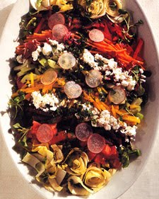 Scatter shredded lettuce on a serving platter. Arrange vegetables, radicchio, endive, and cheese in separate rows on top of lettuce.