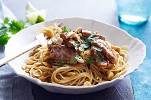 DRAIN pasta. Add to broth mixture in skillet; stir to coat. Spoon pasta mixture into soup bowls; top with meat mixture, nuts and cilantro.