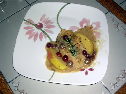 Chicken with apple and grapes. Has a delicious gravy with a hint of rosemary. Very easy to make.