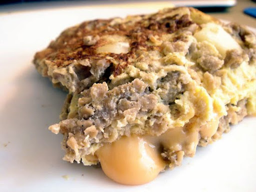 After potato mixture has cooked for 10 minutes, add oil, salt, pepper and reserved sausage. Stir the egg mixture into skillet.