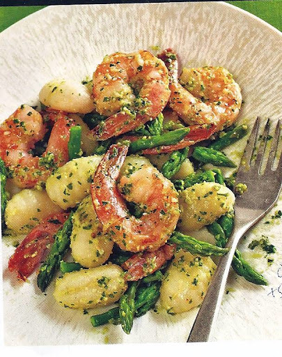 2. Meanwhile, add gnocchi to boiling water. Cook 4 minutes or until done (gnocchi will rise to surface). Remove gnocchi from water with a slotted spoon and place in pan with shrimp and asparagus.