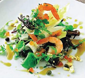 En el plato de servir, coloque los brotes de ensalada y las endibias. Ponga encima de esta cama las tiras y las huevas de salmón, los langostinos y las alcaparras. Espolvoree todo con el huevo duro y el perejil picados. Prepare en un cuenco la vinagreta, echando primero la sal y el vinagre, y luego, el aceite y el zumo de limón (las proporciones son: 1 de vinagre por 3 de aceite y 1/2 de zumo de limón). Bátalo todo muy bien.