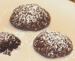 Line a baking sheet with parchment paper. Use an ice cream scoop to form the dough into 1 inch balls. Working quickly, roll the balls into granulated sugar. Place on the Baking sheet 2″ apart. Bake at 325 for 12 minutes, until the centres are moist, but not wet. Cool slightly. Dust lightly with powdered icing sugar. Makes about 36 cookies.