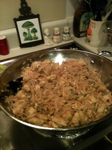 Soak rice noodles in hot water for approximately 5 minutes until "al dente." (Do not "cook" - just pour boiling water over them in a large bowl, and let sit.) Drain.