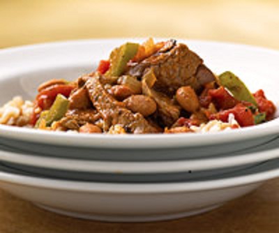 To serve, spoon hot rice into soup bowls. Arrange meat on top of rice. Spoon bean mixture over meat. If desired, sprinkle with crumbled cheese.