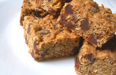 Heat oven to 375. Coat a 8 X 8 baking pan with nonstick cooking spray. Set aside. In a small bowl, whisk flour, baking powder and salt together. In a large bowl, beat sugar and butter on medium high speed until fluffy. Beat in vanilla. Mix in milk then flour mixture. Stir in oats and 1 cup of the chocolate chips. Spread batter into prepared baking pan. Bake at 370 for 35 minutes or until done. Cool completely on a wire rack. Microwave remaining 1/4 cup chocolate chips for 30 seconds. Stir until smooth. Drizzle over bars. Cut into squares.
