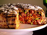 Preheat the oven to 350 degrees F. Line the springform pan with the grilled eggplant. Be sure that the slices overlap and hang over the edge of the pan. Fill the pan with the pasta mixture, pressing down to make sure the pan is filling up evenly. Fold the eggplant slices up over the top of the pasta and add a few more slices on top to completely enclose the timbale. Bake the timbale until warmed through and the cheese has melted, about 30 minutes. Let rest on the counter for 10 minutes to set.