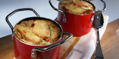 1. In a large non-stick saucepan, brown the onions in the butter until golden and soft, about 30 minutes. Season with salt and pepper. Dust with the flour and cook for 1 more minute. Add the beer and bring to a boil, stirring constantly. Add the broth and bring to a boil. Reduce the heat and simmer for about 10 minutes. Add more broth if necessary. Adjust the seasoning.