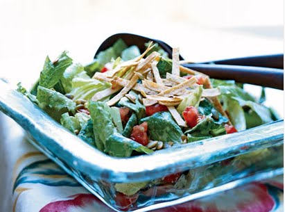 Place lettuce in a large bowl. Add pumpkinseeds and Chile-Cilantro Dressing; toss gently to coat. Place about 1 1/2 cups salad on each of 4 plates. Top each serving with 2 tablespoons tomato; sprinkle evenly with tortilla strips.