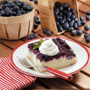 Carefully pour over blueberries. Bake at 350° for 40-45 minutes or until a toothpick inserted near the center comes out clean. Immediately invert onto a serving platter. Cool. Serve with whipped topping if desired. Yield: 6-8 servings.