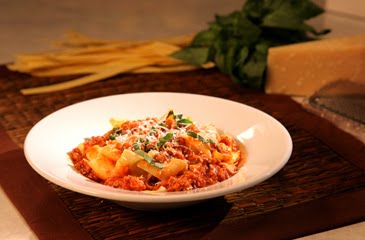 Heat a saucepan on medium-high heat. Add the olive oil until hot, add onions, turn down heat to medium and sauté for 2 minutes. Add carrots and celery, sauté for 25 minutes. Add the ground beef and ground pork, breaking up the meat as much as you can while in the pan.