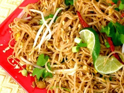 Put on a plate and add peanuts, lime, cilantro, green onions, dried chilies. (These we usually have in a bowl and add what we want).