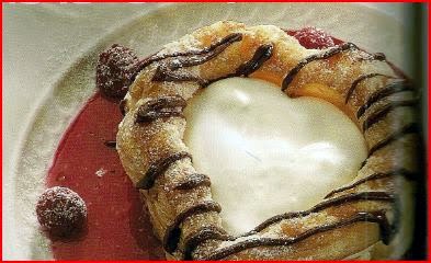 Distribute the raspberry purée among 6 plates. Arrange a whole heart on each plate, and cover with a thin layer of mascarpone cream. Place a heart-shaped ring on top to form 6 heart-shaped vol-au-vents. Fill the center with more mascarpone cream. To serve, drizzle with the chocolate syrup, garnish with raspberries, and sprinkle with confectioners' sugar.