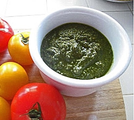 Add all ingredients except the olive oil to the bowl of a food processor & let it run till the ingredients have been thoroughly mixed & puréed. Then, with the motor running, slowly drizzle in the olive oil.