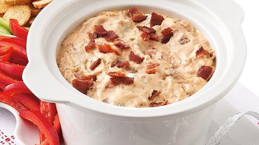 This dip prepared in a slow cooker is perfect for parties with all the great flavors of a bacon cheeseburger! Serve with bell pepper strips and bagel chips. Yum!