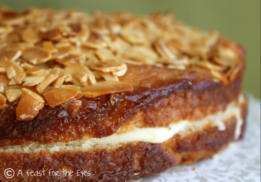 As a military kid, I lived in Germany and my mother was from Bavaria. I remember this cake, fondly, because of the sticky and sweet honey almonds and the creamy filling. My “Oma” would buy one of these cakes, at the local bakery and serve thick slices with coffee. There are many versions as to how the cake got it’s name— According to Wikipedia: “the cake may have earned its name from its honey topping: according to one legend, a bee was attracted to it, and the baker who invented the cake was stung. Another source cites a legend of German bakers from the 15th century who lobbed beehives at raiders from a neighboring village, successfully repelling them, and celebrated later by baking a version of this cake named after their efforts.” The cake is not very sweet. It has the texture of pastry, and the pastry cream is mildly sweet. The honey almonds…oh, that is really what makes this cake so special! It’s sticky and honey sweet, with just the right amount of richness of butter—I could eat a bowl of the almond topping all by itself.