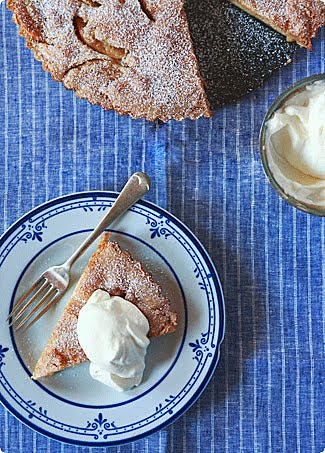 Preheat the oven to 350F/175C. Generously butter an 11-inch (28cm) nonreactive tart pan or other similarly-sized glass or ceramic baking dish. Toss the apples in a bowl with the lemon juice and 2 tablespoons of the sugar. Spread the apples evenly in the prepared pan.