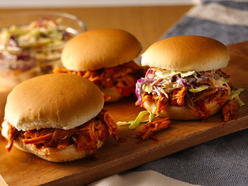 Serve 1/2 cup chicken mixture on each bun. Top each with 2 tablespoons coleslaw.
