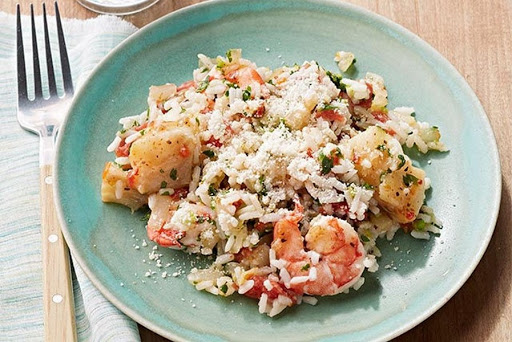 This grilled seafood and rice recipe brings a new elegance to outdoor eating. But don't worry, we've simplified prep and cleanup by using a foil pan!