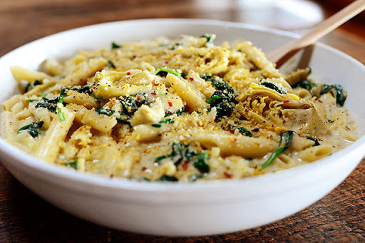 Add artichokes and pasta, tossing gently to combine. Gently fold in spinach, then pour the pasta into a serving bowl. Sprinkle the top with crushed red pepper flakes and plenty of Panko breadcrumbs for crunch.